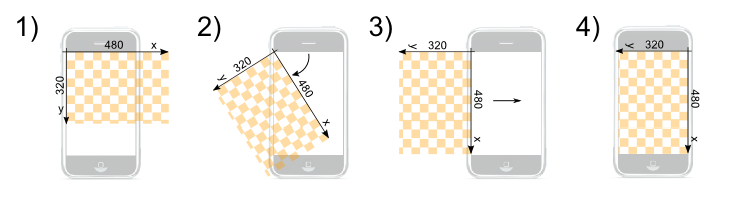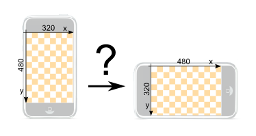 Now, take a piece of paper that has the same size as the pin board, and lay it down before you in landscape (!) mode. Draw the origin at the top left, and the axes (the x-axis going right for 480mm, the y-axis going down for 320mm). That paper represents the coordinate system we want: one that is in landscape mode.