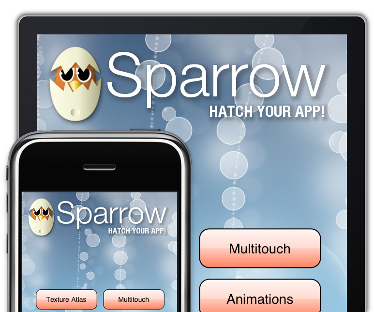 atlasWithContentsOfFile:@"atlas.xml"];Behind the scenes, Sparrow will load the correct texture for you. The “width” and “height” properties of the loaded images and textures will always be the size of the low resolution (!) textures. That way, you can pretend that you are developing the game only in the low resolution. The HD-version will be a side-product you don’t have to think about while you are writing your game in Xcode.