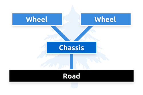 This type of hierarchical representation of your display objects allows us to build more complex setups that combine different types of objects - e.g. a car with four wheels and a chassis - into one branch of the tree. Attaching (or pinning) the four wheels of the car as leaf nodes to its chassis for example allows us to forget about the wheels for our racing game: As soon as we move or rotate the chassis the wheels will follow as we would expect them to.