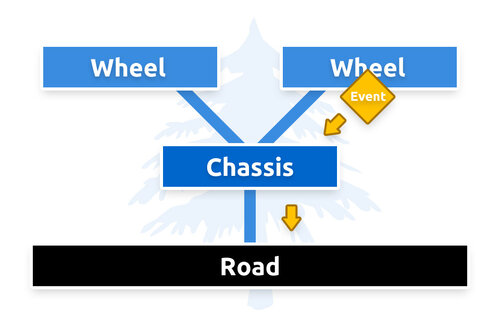 In Sparrow, just like in ActionScript, any display object within the display tree can fire events. Once fired those events travel down along the branches of the display tree and visit every related node until they hit the root node a.k.a. the stage. For example the wheel of a car can fire a FlatTire event: That FlatTire event would immediately start traveling towards the stage. On it’s way it would visit the car object itself which could subsequently react to the event by lighting a red bulb on the car’s dashboard or even more spectacular starting to fishtail off the road, overturn and explode.