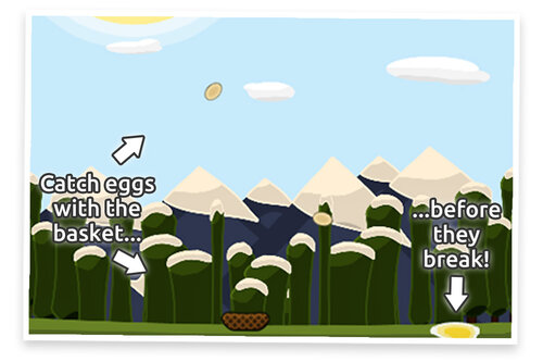 @endOur game just went from meh to yay! The eggs are falling in a more or less believable way and the user is able to catch them with the basket. If he fails to do so they smash into the ground and break.
