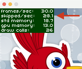 The Statistics Display now shows the number of frames that are currently being skipped per second. Remember, with starling.skipUnchangedFrames enabled, Starling will skip rendering of any unchanged frames, which is a fantastic way to reduce battery consumption. With the updated statistics, it will be easier to optimize your code for this setting.